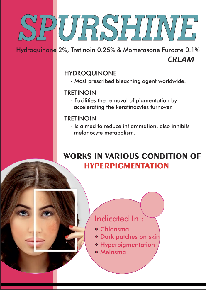 Spurshine Cream is a potent combination of Hydroquinone 2%, Tretinoin 0.25%, and Mometasone Furoate 0.1%, specifically formulated to treat a variety of hyperpigmentation issues, including melasma, chloasma, dark patches, and general skin discoloration. It works by reducing pigmentation, lightening dark spots, and preventing new discoloration from forming, making it one of the most prescribed treatments for hyperpigmentation worldwide.
